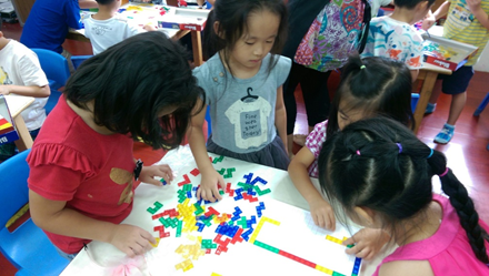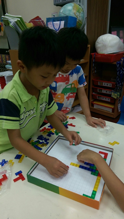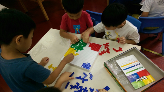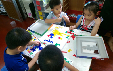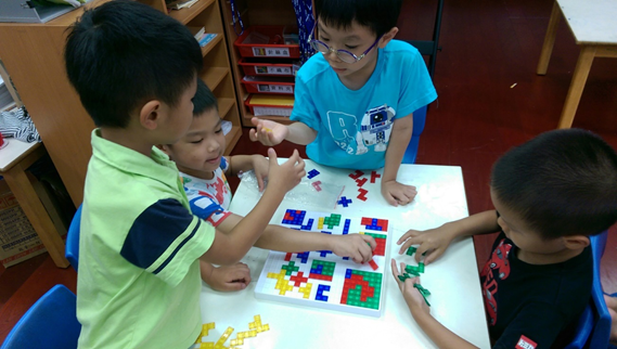 此階段的孩子,處在「聯合遊戲」及「團體遊戲」之間,孩子們開始喜歡「一起」做相同或類似的活動,甚至漸漸進入有組織性的遊戲架構,比如開始會有彼此間發展出來的遊戲規則等,用以上操作方法,會發現孩童會樂於觀察彼此拼放正方形的方式,在一起用板塊拼成具體圖案時,孩童會在同一個目標中,加入自己的期待,從當中互相磨合(溝通:討論、辯論等)。
