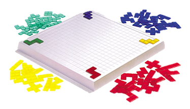 簡單的介紹此款遊戲,此款遊戲由四個顏色的板塊組成,每個玩家將選擇一個顏色進行遊戲,每個顏色擁有21片分別由「方形」組成的形狀版塊(很像俄羅斯方塊),遊戲規則是輪流進行擺放,擺放時與自己顏色的板塊只能接觸到「角」,而不能接觸到「邊」,剩下最少方塊的玩家獲勝。